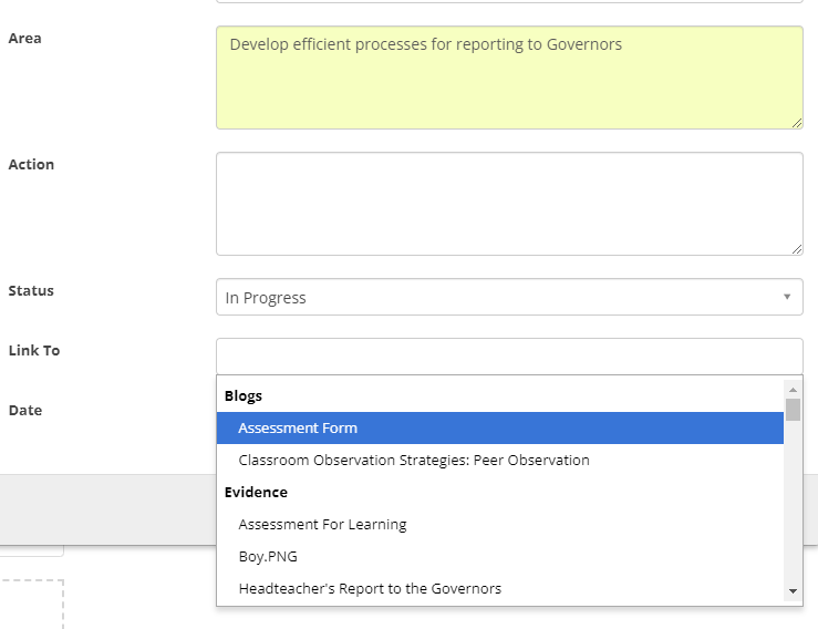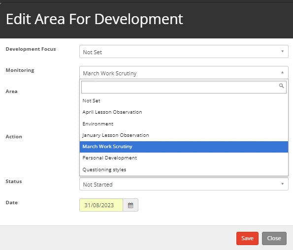 You can now link Areas for Development to monitoring forms by clicking the Monitoring dropdown and selecting the form within the Areas for Development screen.