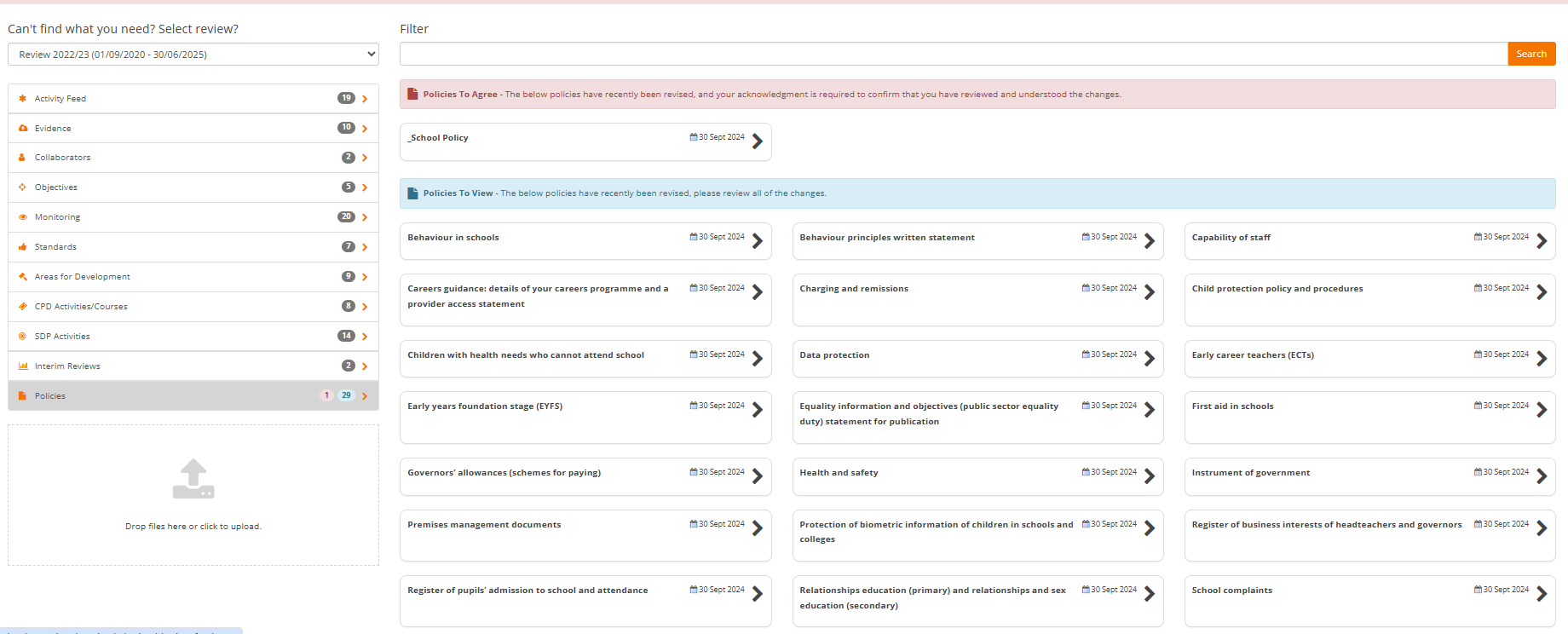The access for policies for teachers, Teaching Assistants, and support staff has been moved to their portfolio to reduce the options and make it easier for them to see the policies that still need to view and/or agree in the system.