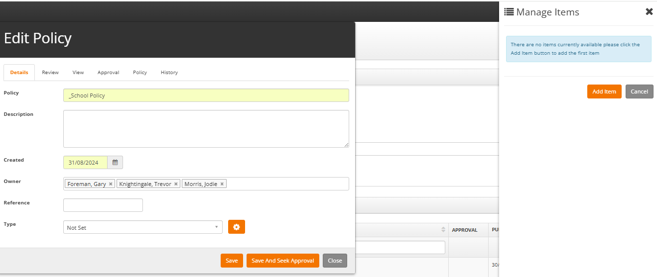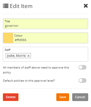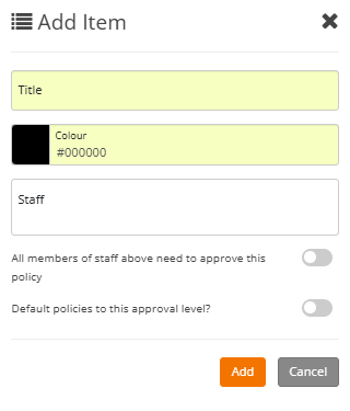 Clicking the add option will allow you to set the relevant fields for that item in the list (Below is an example for Approval Level) which show Title, Background Colour, and staff set for the approval level with two other slider options for All members of staff above need to approve this policy and Default policies to this approval level?.