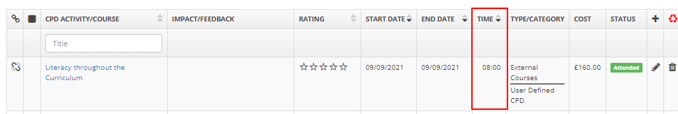 Once set the system will calculate the duration and display it on both the Portfolio CPD Activities screen and the CPD Activities screen available to the CPD Coordinators.