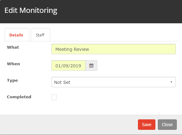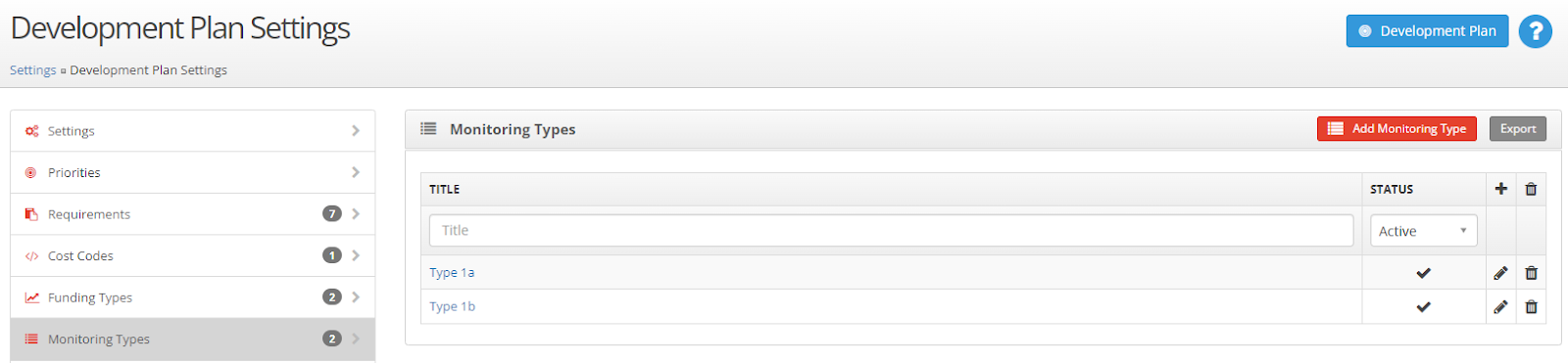 A new lookup has been added to the development plan to allow the monitoring type to be defined. This can then be set when adding a monitoring item.