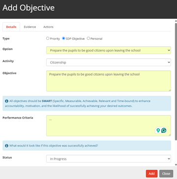 When a staff objective is linked to an SDP Objective the user will get the option to link the evidence to the SDP objective by ticking the 'Add evidence to SDP Objective' checkbox.