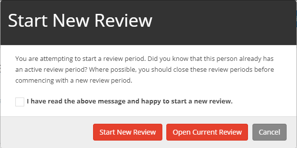 If a user tries to start a review for a staff member that has a review that falls within the dates set then they will be given the following screen to either tick the checkbox to confirm they want to continue or they can select to go to the current open review.