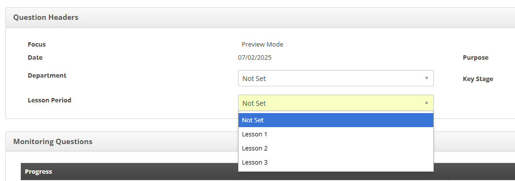 A new Question Header has been added to the system to allow the observers for monitoring forms to indicate the lesson period the monitoring was carried out.
