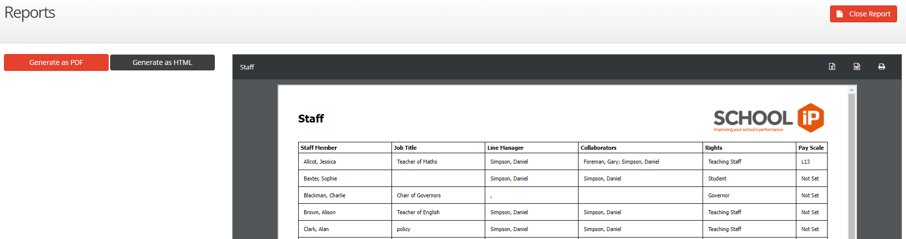 To export the data for the selected review click the export button on the staff members portfolio screen.