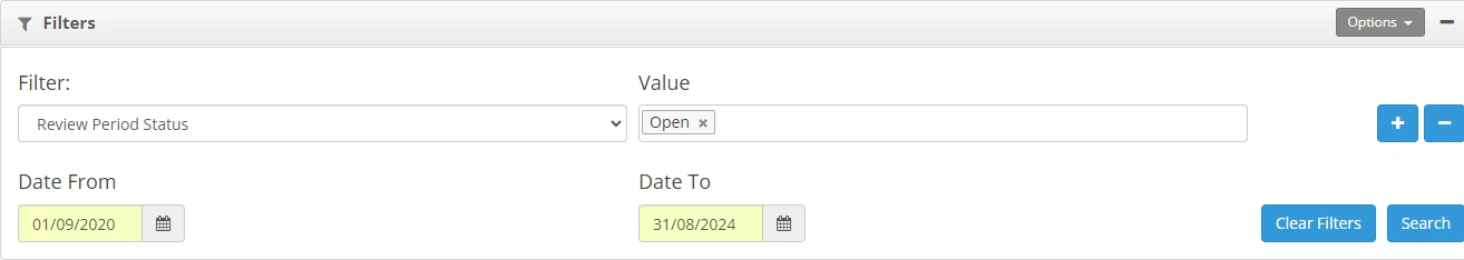 The filters include the option to filter by the review status allowing you see which reviews have been completed or are still open.